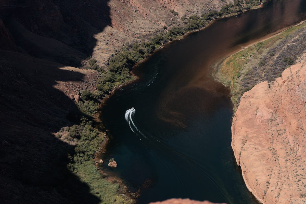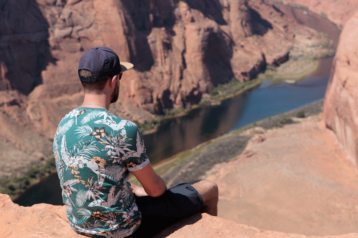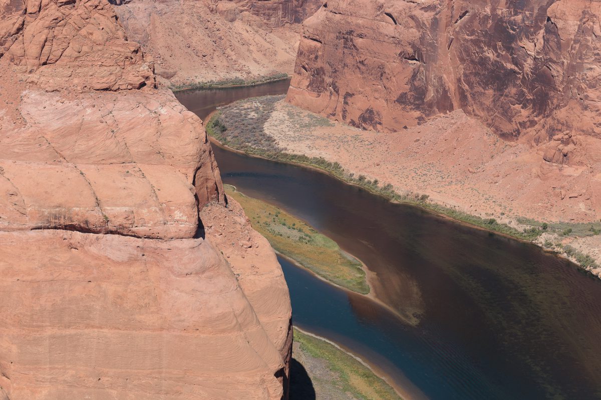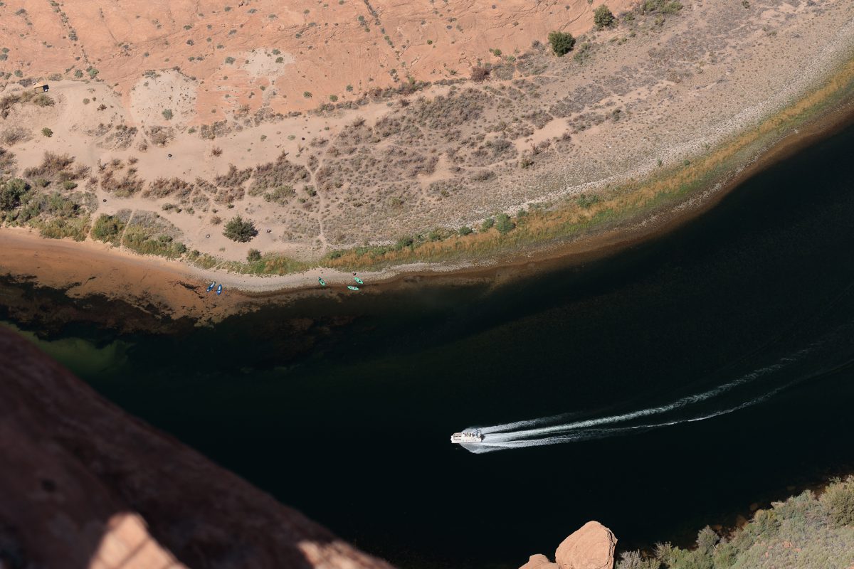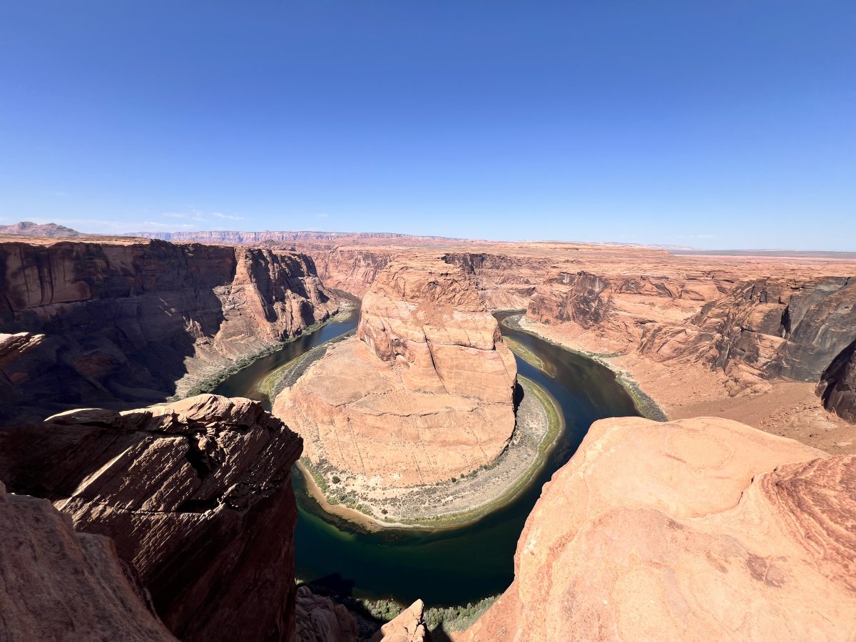 Da alles so schön nah beieinander lag, sind wir von da aus zum Horseshoe Bend gefahren. Diese von den Navajo Indianern betriebene Naturerscheinung war beeindruckend. 1.5 Meilen durch die sengende Hitze laufen – wobei es glücklicherweise zwei überdachte Stände zum Ausruhen auf dem Weg gab – danach wurde man mit einem wahnsinnig tollen Blick auf diesen Riesen Felsen belohnt, um den der Colorado River herumfließt. Die Boote auf dem Fluß sahen aus wie Ameisen, es war unglaublich hoch. Ich bin froh, dahin gelaufen zu sein, das war wirklich ein Erlebnis.