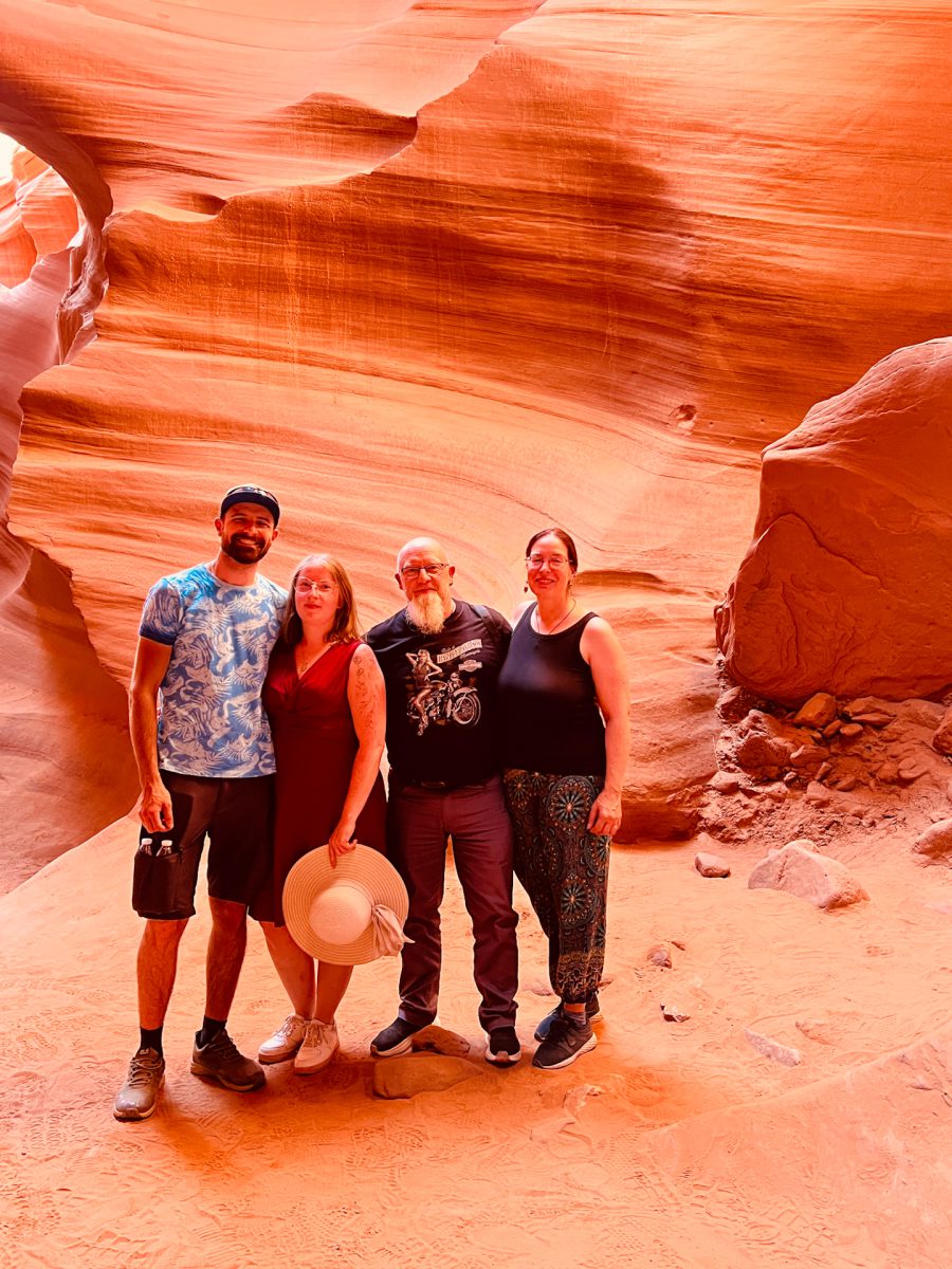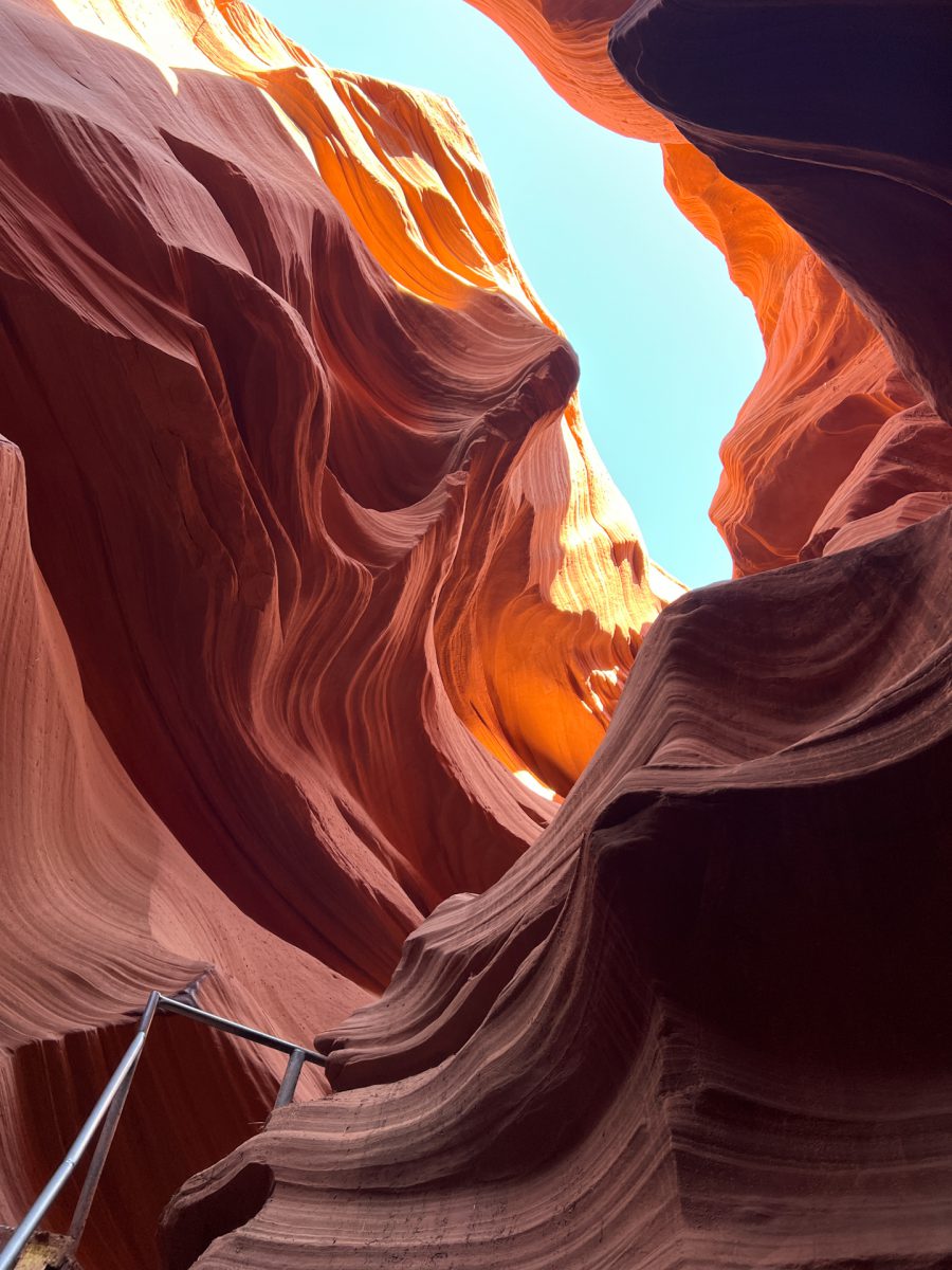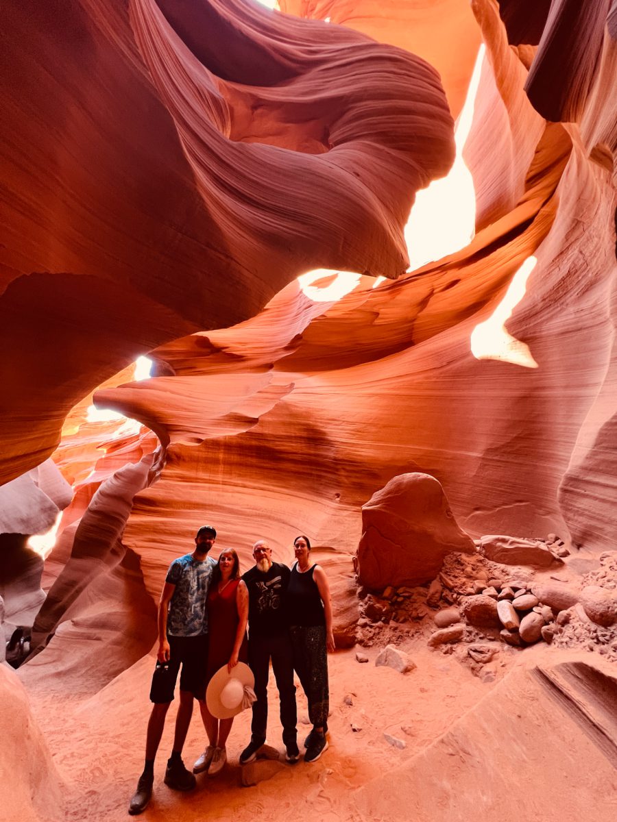Nach dem Einchecken wurden wir in 5 Gruppen eingeteilt. Es waren viele Gäste da und wir wurden in Gruppe 5 eingeteilt. Unser Guide war sehr entspannt und echt nett. Er hat uns gleich gefragt,woher wir kommen und ob wir das erste Mal hier seien. Nach einer kleinen Plauderei mussten wir dann in die Gruppe 4 wechseln. Unser Guide war weiblich und hieß Makaya yellowhorse. Sie war auch sehr nett und führte uns durch den Canyon, der mit eisernen Leitern und Treppen gesichert war. Der Canyon lag in der Erde und wir mussten erst eine kleine Strecke herunter klettern. Die Tour war atemberaubend. Der Canyon ist wunderschön und Makaya hat an bestimmten Spots Halt gemacht und uns auf gute Fotogelegenheiten aufmerksam gemacht. Zweimal hat sie sogar die Fotos für uns gemacht, was sehr gut geworden ist. Sie hat uns auch von früheren Touren erzählt, auch von Klettertouren. Bei derr letzten Klettertour ist von der ganzen Gruppe nur der Tourguide schwer verletzt herausgekommen, als sie von einer Flutwelle erwischt wurden. Bei Gewitter und Starkregen wird der Canyon überschwemmt. Heutzutage schaute man immer vorher auf die Gewitter- und Flutwarnungen, bevor man mit den Gästen unter die Erde geht. Sie hat uns auch ein Bild gezeigt von einem Greifvogel, vielleicht einem Bussard, der im Canyon nistet. Das Nest konnte man sehen. Auch eine Eule konnte sie fotografieren. Total schön!! Außerdem hat sie noch erzählt, dass es im Canyon Spinnen gibt, die die Skorpione fressen, die es hier ebenfalls gibt. Aber wir haben – Gott sei Dank – keine achtbeinigen Tiere entdeckt. Es war sehr angenehm unten im Canyon und es wurde erst wieder heiß, als wir an die Oberfläche kamen.