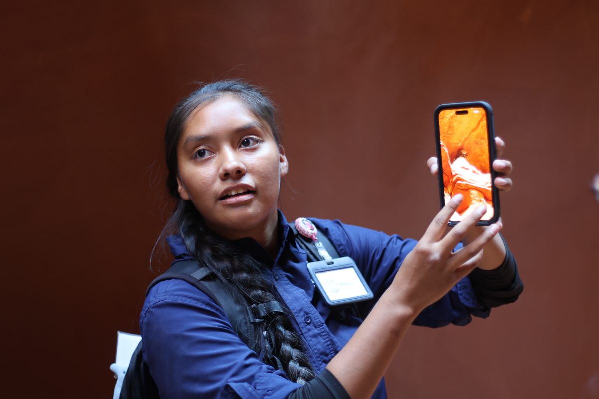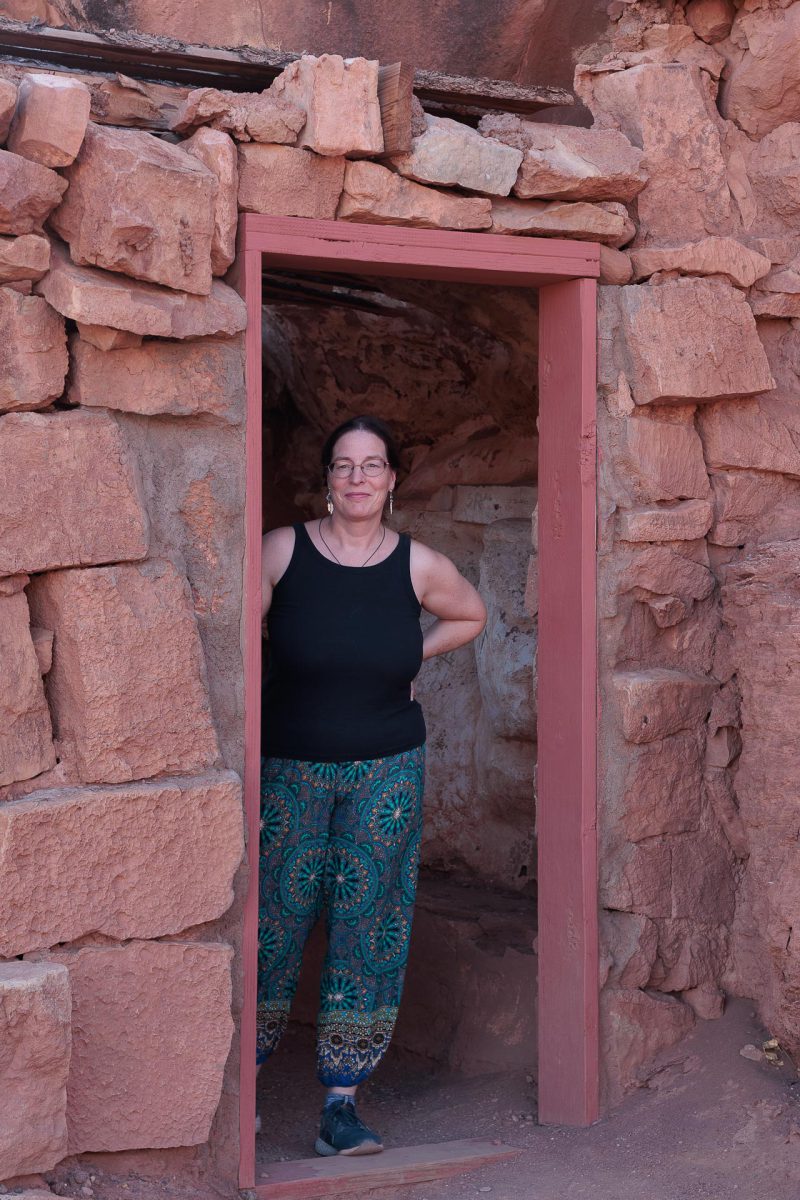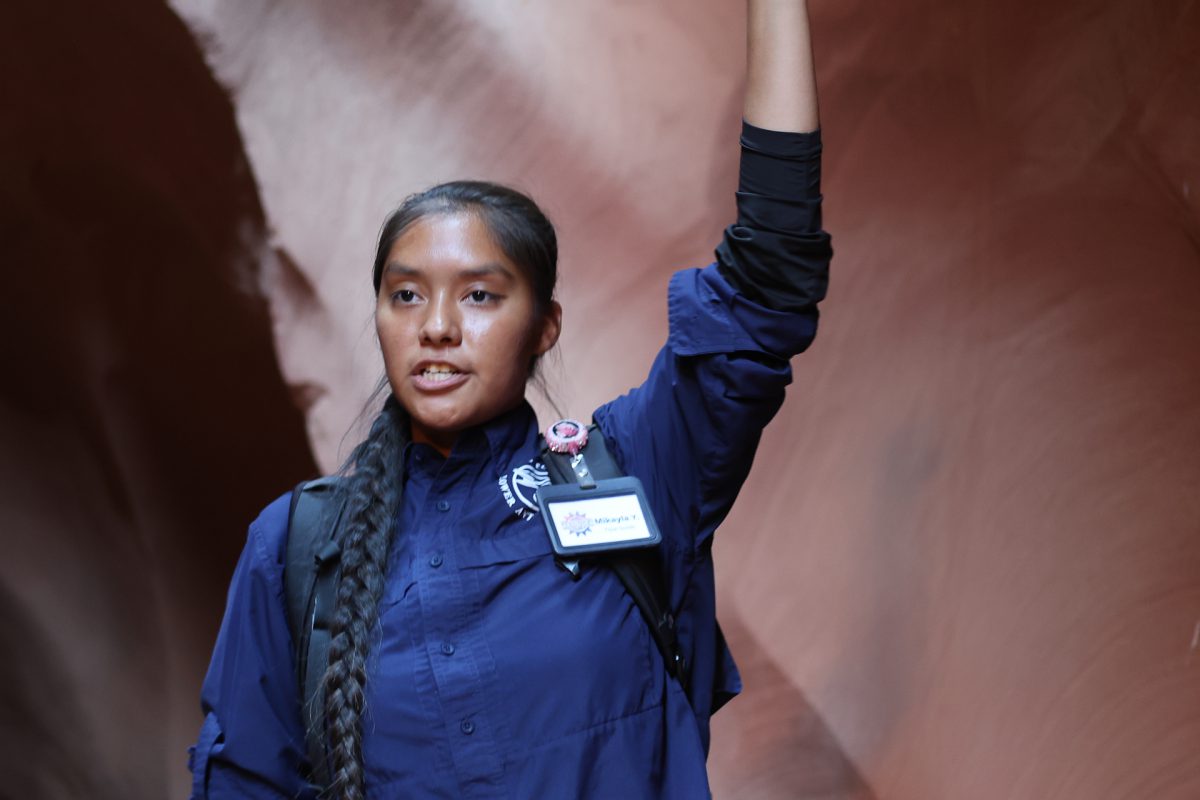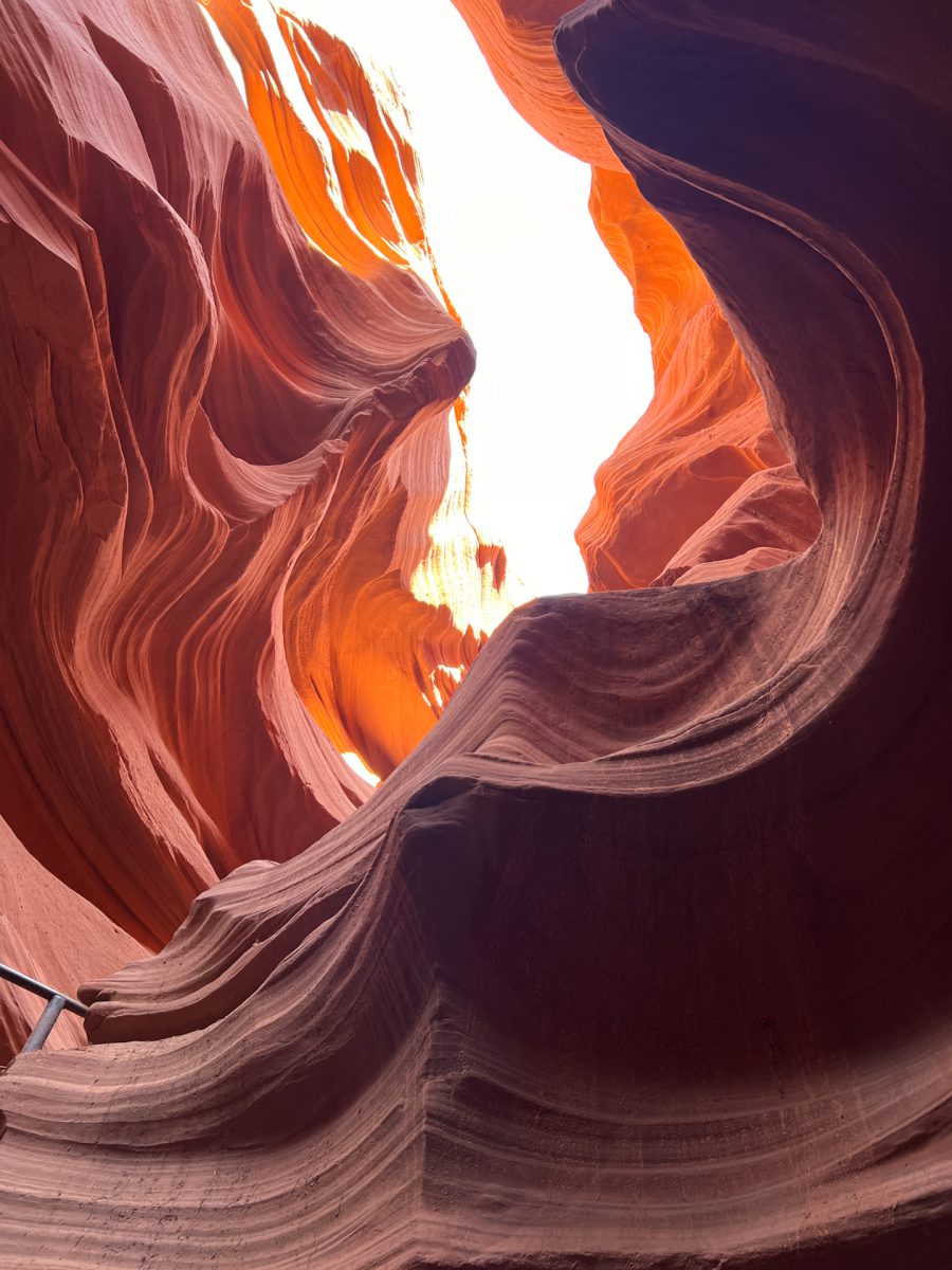 Nach dem Einchecken wurden wir in 5 Gruppen eingeteilt. Es waren viele Gäste da und wir wurden in Gruppe 5 eingeteilt. Unser Guide war sehr entspannt und echt nett. Er hat uns gleich gefragt,woher wir kommen und ob wir das erste Mal hier seien. Nach einer kleinen Plauderei mussten wir dann in die Gruppe 4 wechseln. Unser Guide war weiblich und hieß Makaya yellowhorse. Sie war auch sehr nett und führte uns durch den Canyon, der mit eisernen Leitern und Treppen gesichert war. Der Canyon lag in der Erde und wir mussten erst eine kleine Strecke herunter klettern. Die Tour war atemberaubend. Der Canyon ist wunderschön und Makaya hat an bestimmten Spots Halt gemacht und uns auf gute Fotogelegenheiten aufmerksam gemacht. Zweimal hat sie sogar die Fotos für uns gemacht, was sehr gut geworden ist. Sie hat uns auch von früheren Touren erzählt, auch von Klettertouren. Bei derr letzten Klettertour ist von der ganzen Gruppe nur der Tourguide schwer verletzt herausgekommen, als sie von einer Flutwelle erwischt wurden. Bei Gewitter und Starkregen wird der Canyon überschwemmt. Heutzutage schaute man immer vorher auf die Gewitter- und Flutwarnungen, bevor man mit den Gästen unter die Erde geht. Sie hat uns auch ein Bild gezeigt von einem Greifvogel, vielleicht einem Bussard, der im Canyon nistet. Das Nest konnte man sehen. Auch eine Eule konnte sie fotografieren. Total schön!! Außerdem hat sie noch erzählt, dass es im Canyon Spinnen gibt, die die Skorpione fressen, die es hier ebenfalls gibt. Aber wir haben – Gott sei Dank – keine achtbeinigen Tiere entdeckt. Es war sehr angenehm unten im Canyon und es wurde erst wieder heiß, als wir an die Oberfläche kamen.