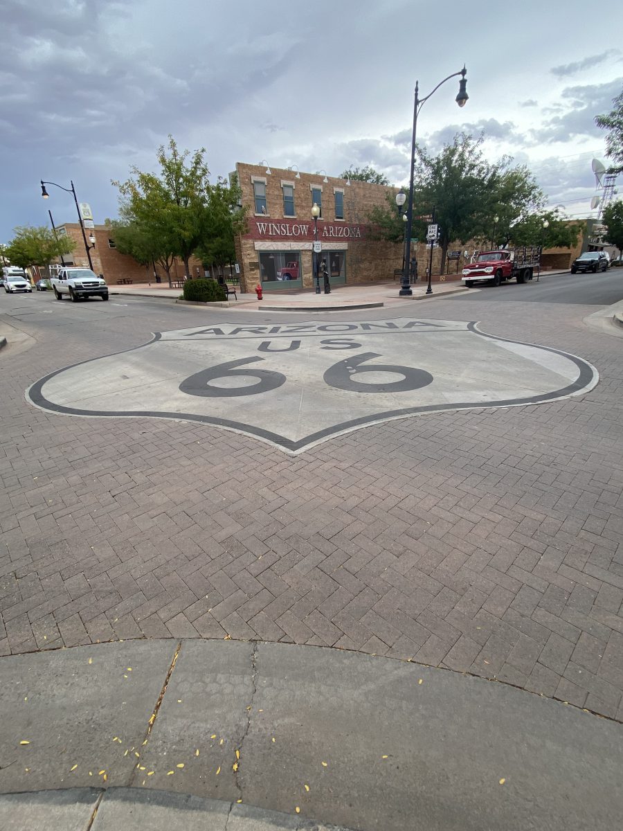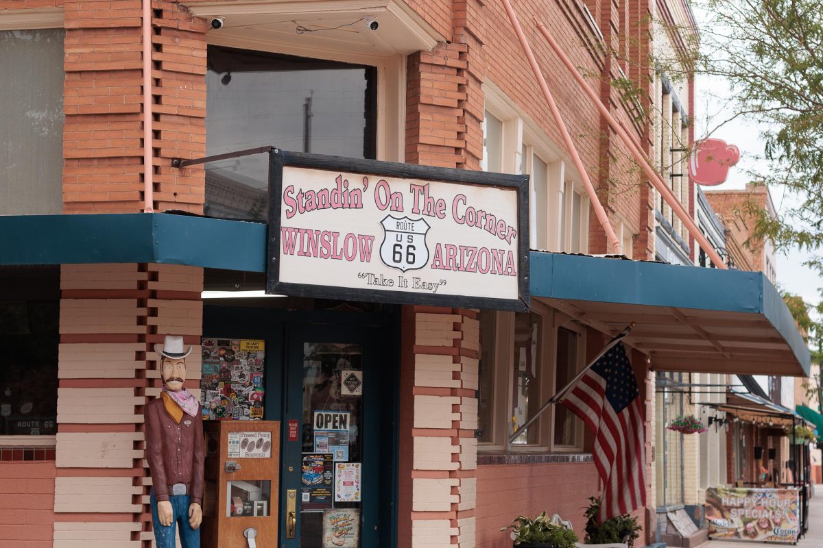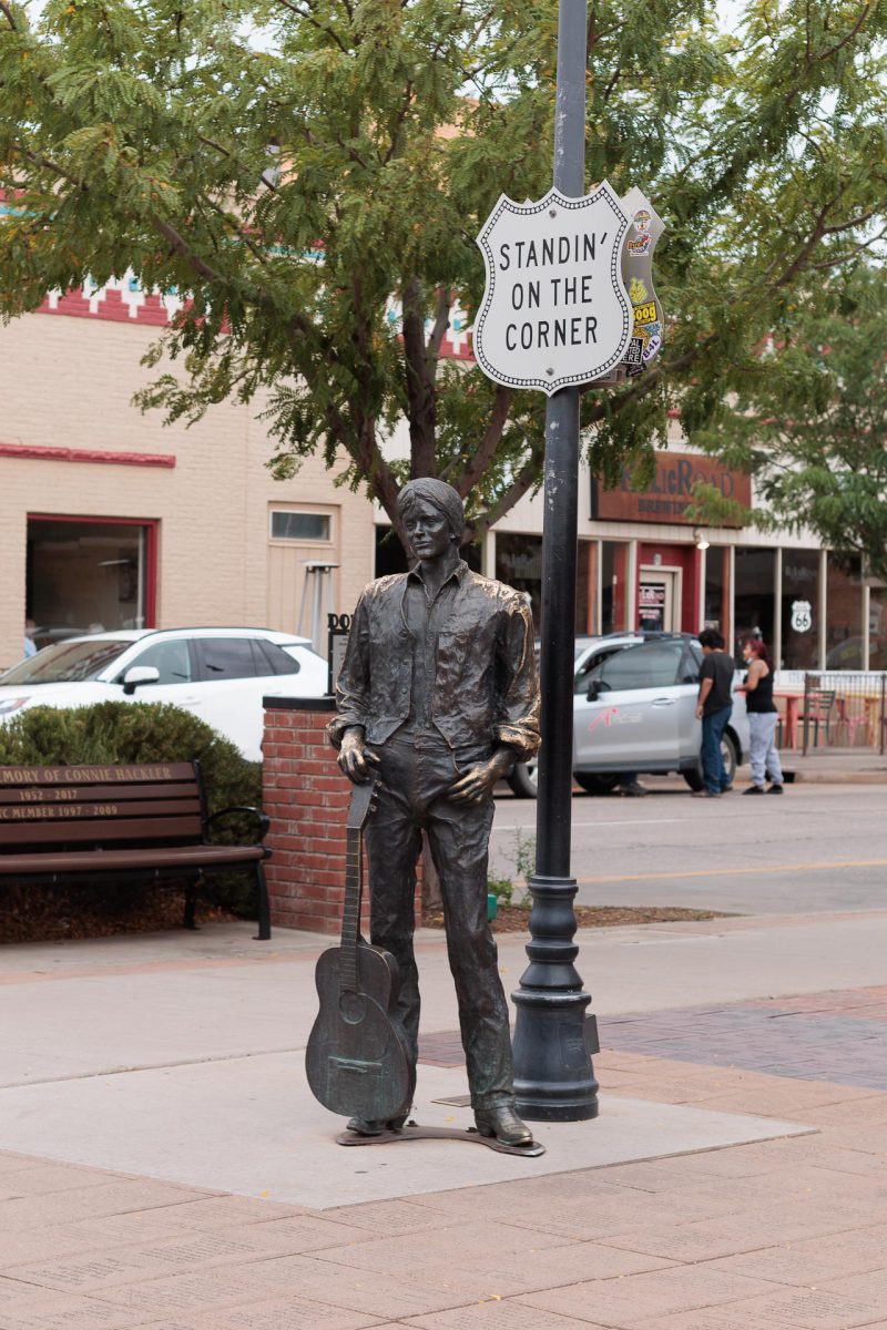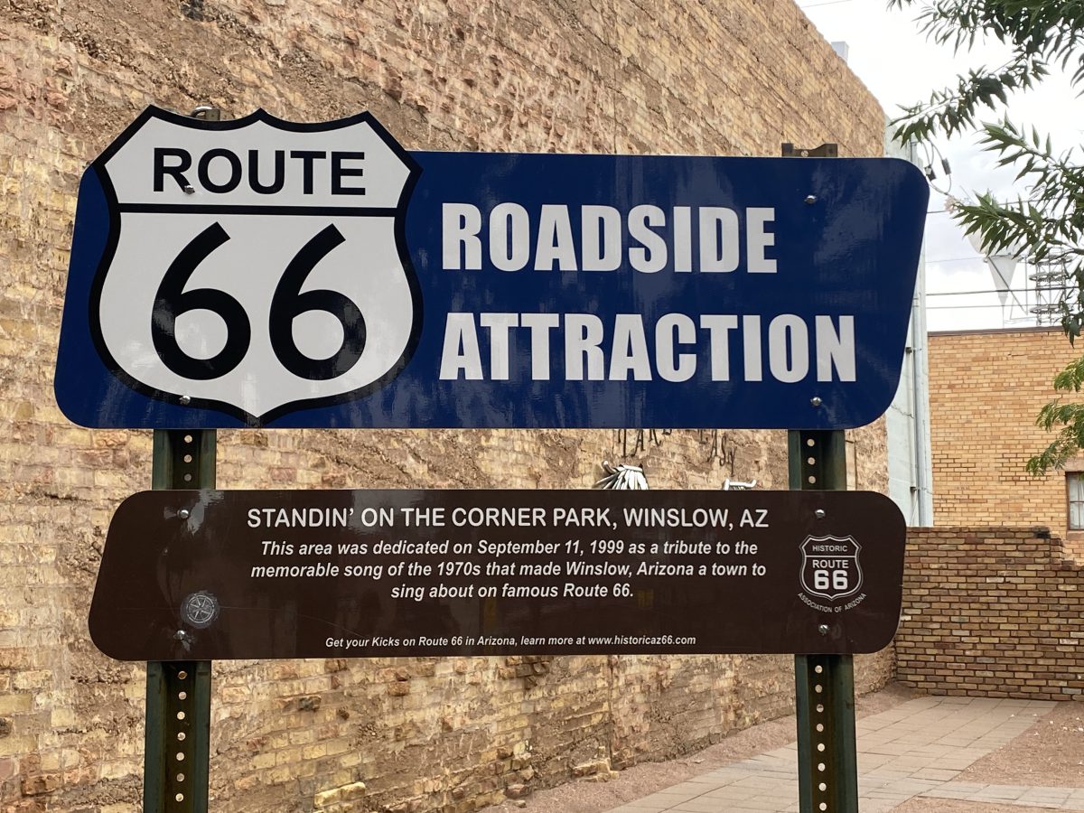 Danach marschierten wir noch zu der berühmten Corner, an der man stehen musste. Es war doch ein etwas längerer Spaziergang, als wir dachten – aber wir haben die Kreuzung gefunden. Mitten drauf das Symbol der Route 66, rundherum Läden mit Geschenken, Schildern, usw. Es hab eine Erinnerungsmeile und natürlich stand dort auch die Statue, an der man das Foto machen konnte.