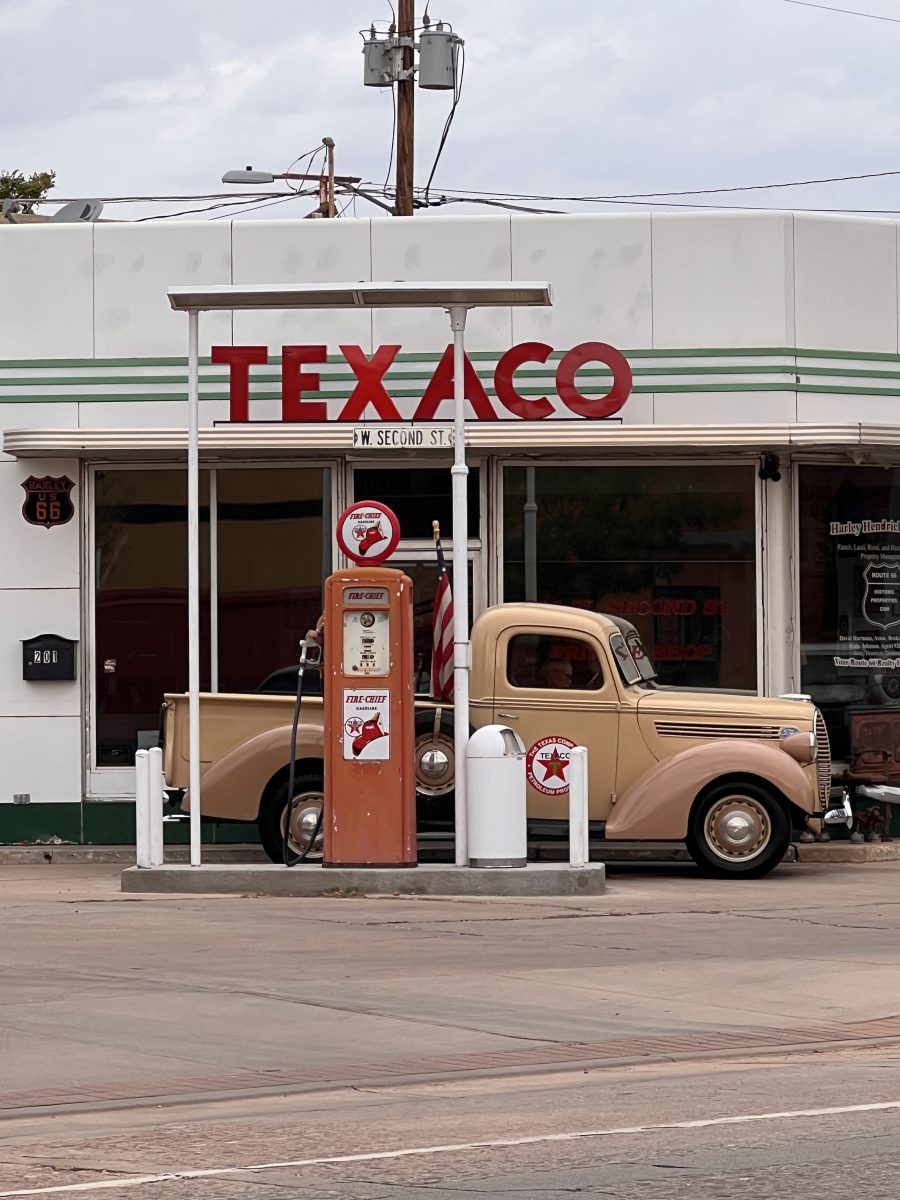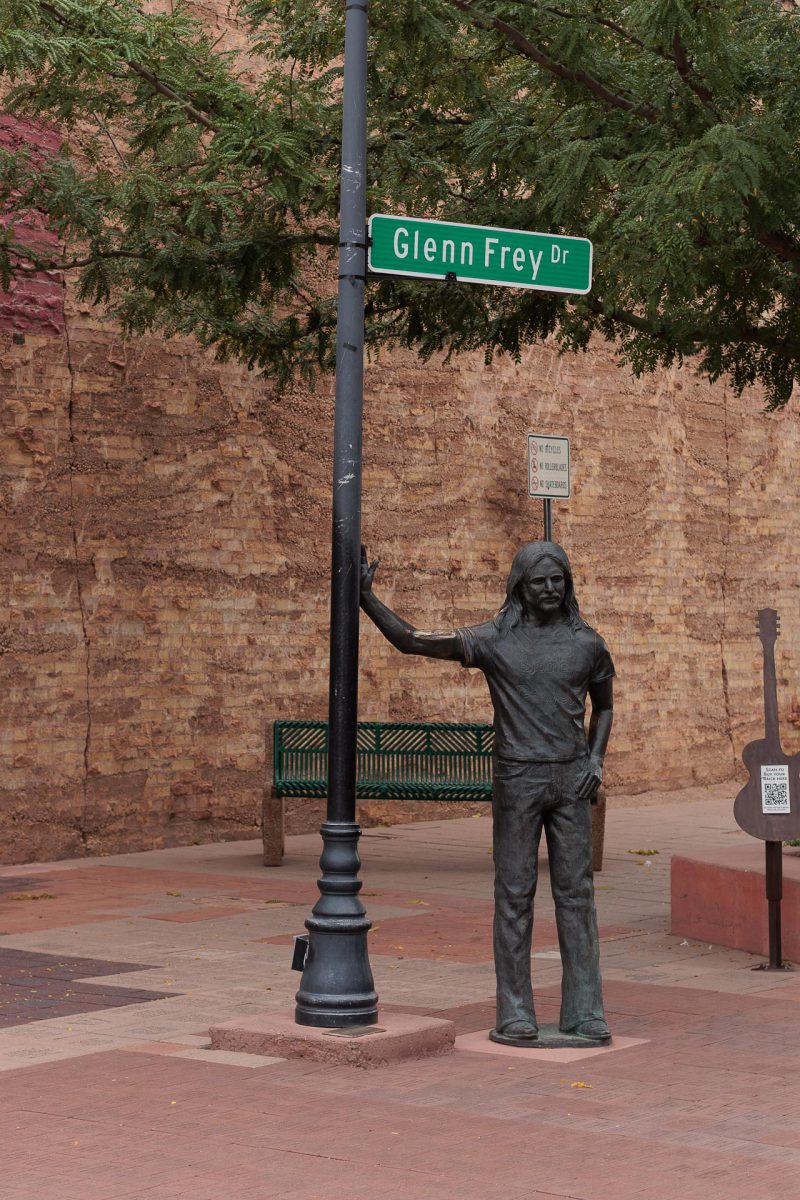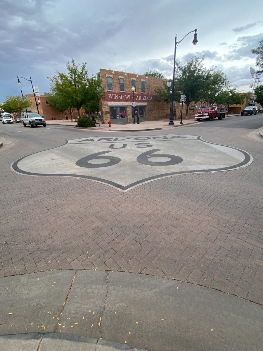Danach marschierten wir noch zu der berühmten Corner, an der man stehen musste. Es war doch ein etwas längerer Spaziergang, als wir dachten – aber wir haben die Kreuzung gefunden. Mitten drauf das Symbol der Route 66, rundherum Läden mit Geschenken, Schildern, usw. Es hab eine Erinnerungsmeile und natürlich stand dort auch die Statue, an der man das Foto machen konnte.