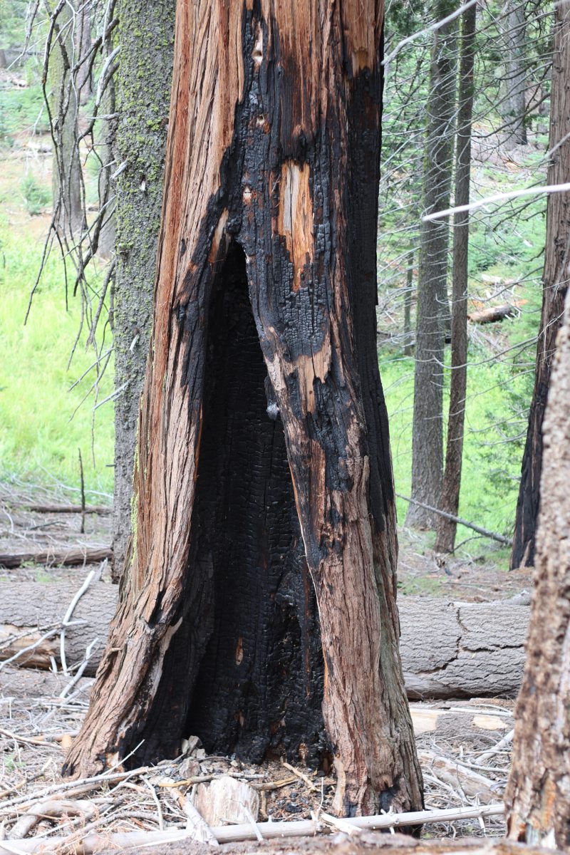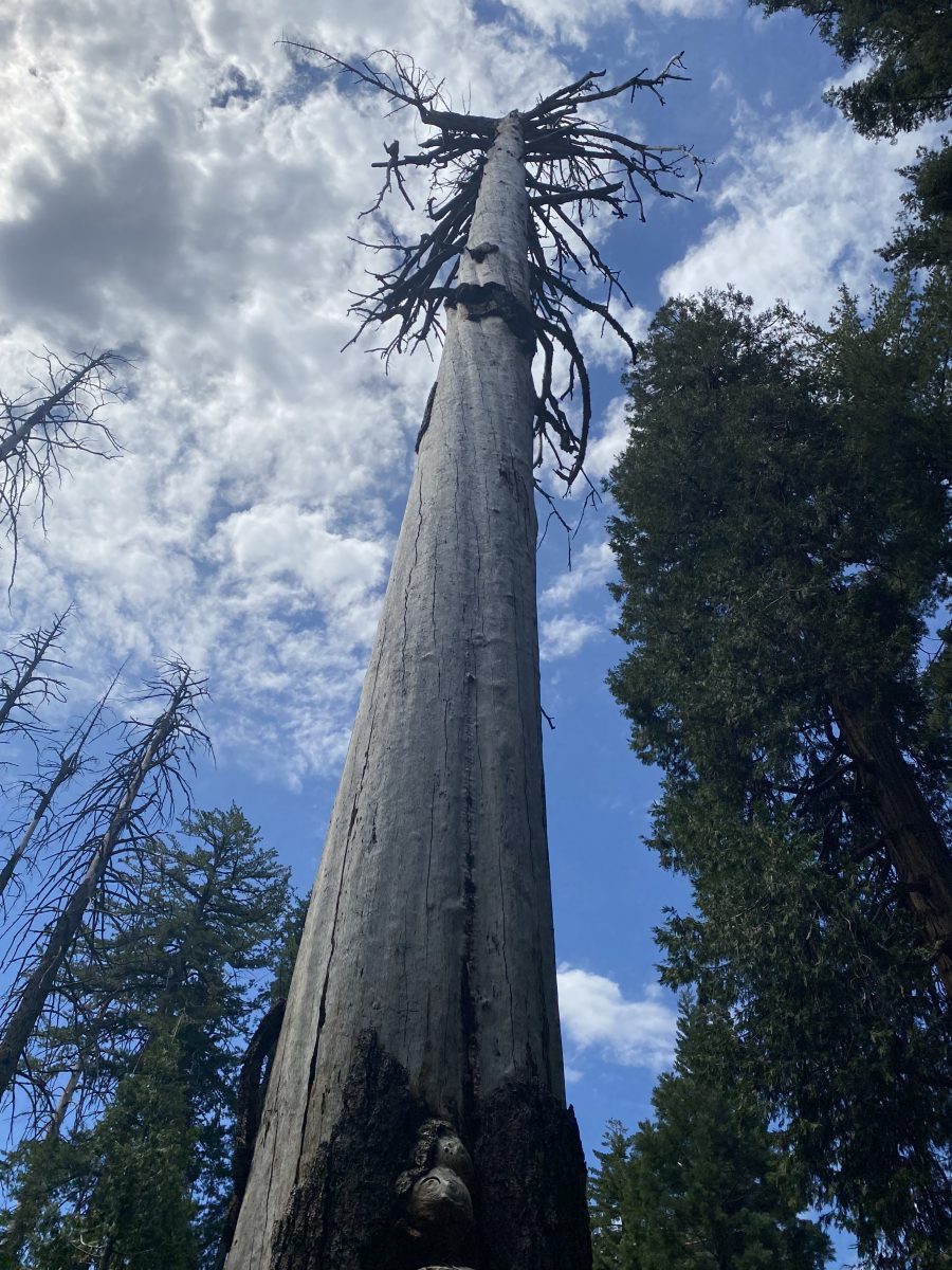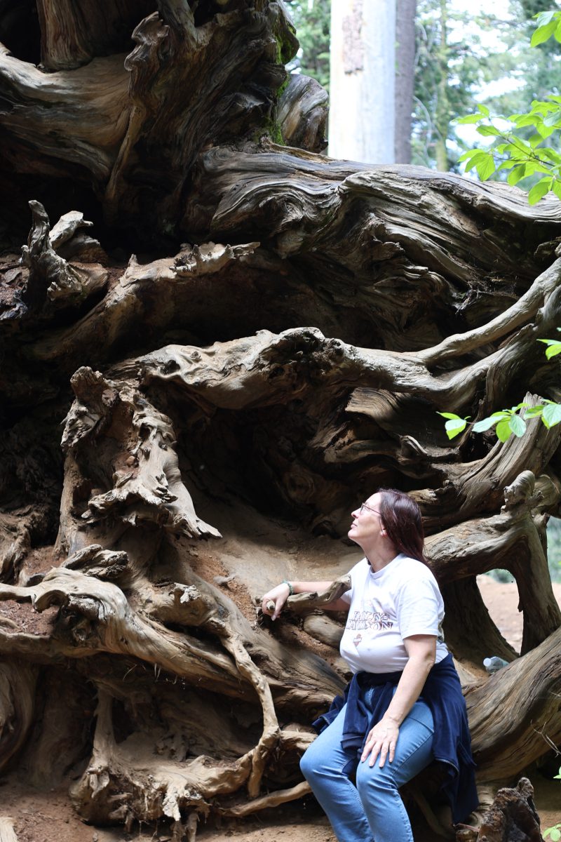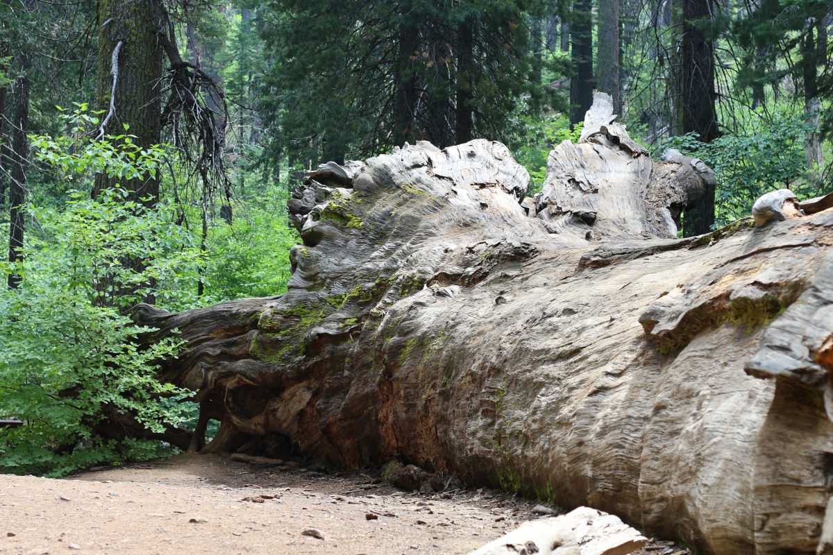Anton und Sophie spazierten schon vorweg und wir kamen langsam hinterher. An dem ersten Sequoia Baum holten wir sie ein. Er war riesig! Ein beeindruckender Baum, der bis in den Himmel wuchs. Wir gingen weiter und kamen an den umgestürzten Sequoia Baum. Dieser Baumriese war aber trotzdem nicht tot, sondern brummte vor Leben. Kleine Insekten und Holzwürmer ernährten sich von ihm, kleinere Tiere wie Streifenhörnchen fanden Schutz im hohlen Baum und es gab viele weitere Spuren. So erschafft eben das Ende des Lebens neues Leben.